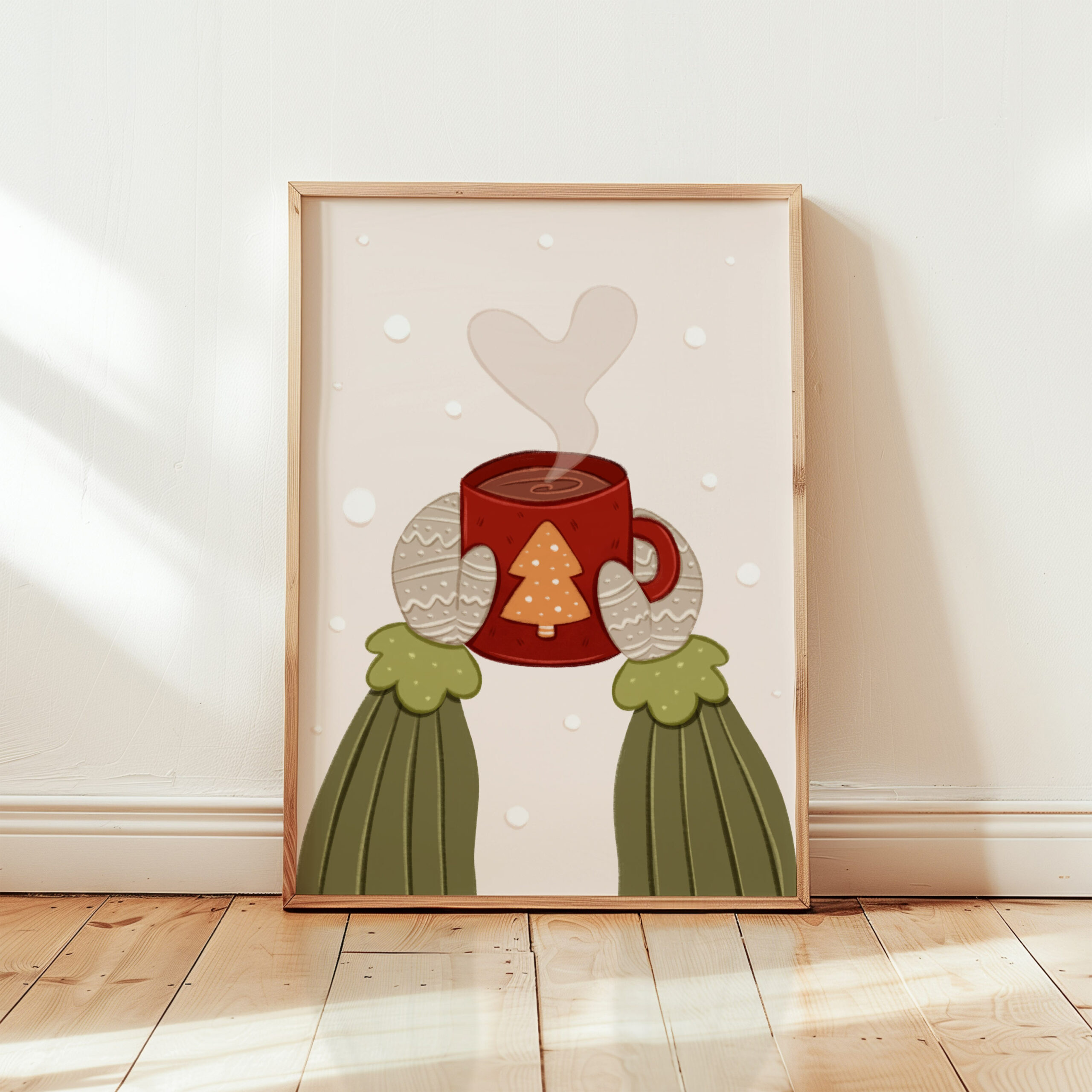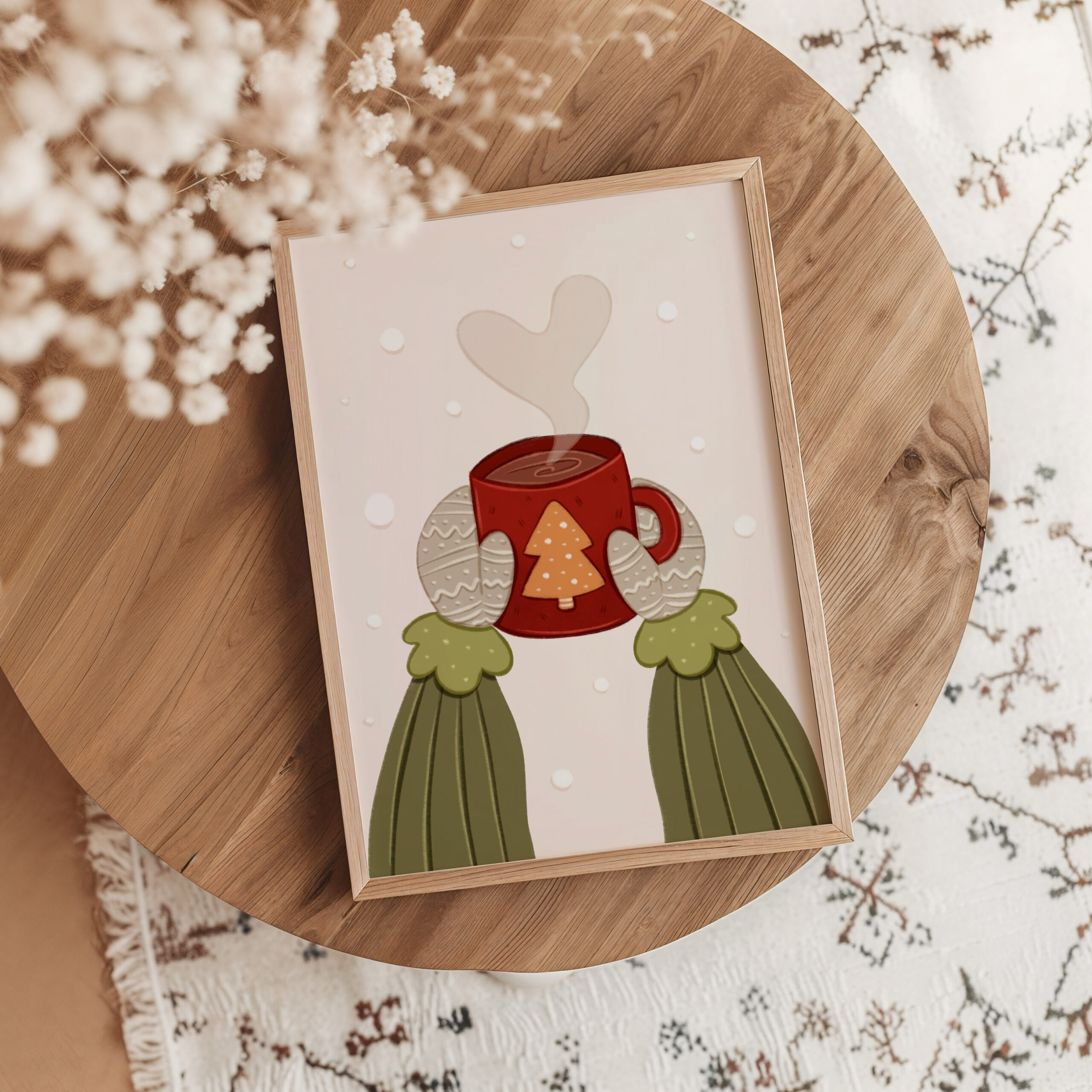 Uroczy plakat świąteczny z dłońmi trzymającymi kubek gorącej czekolady.