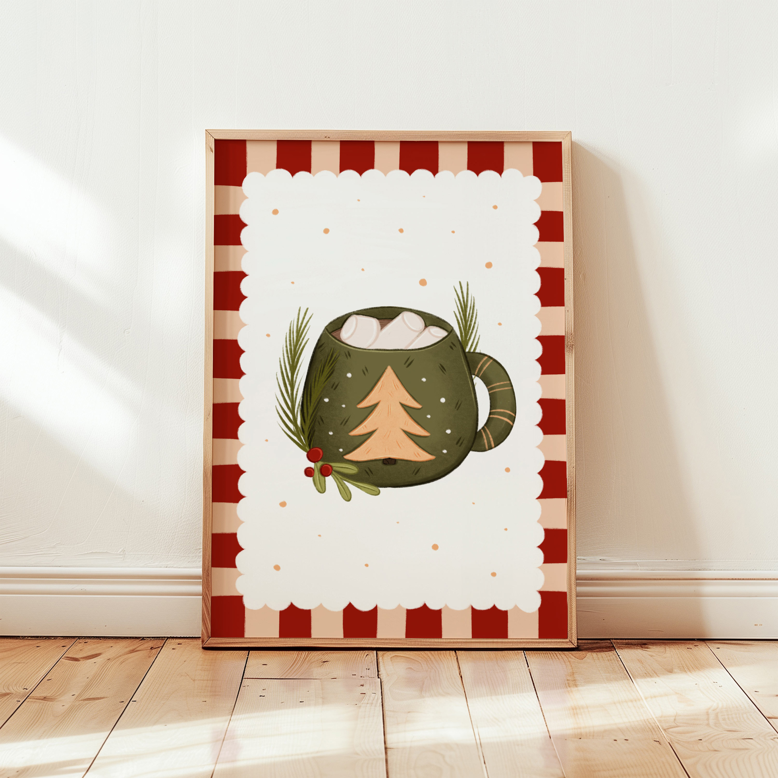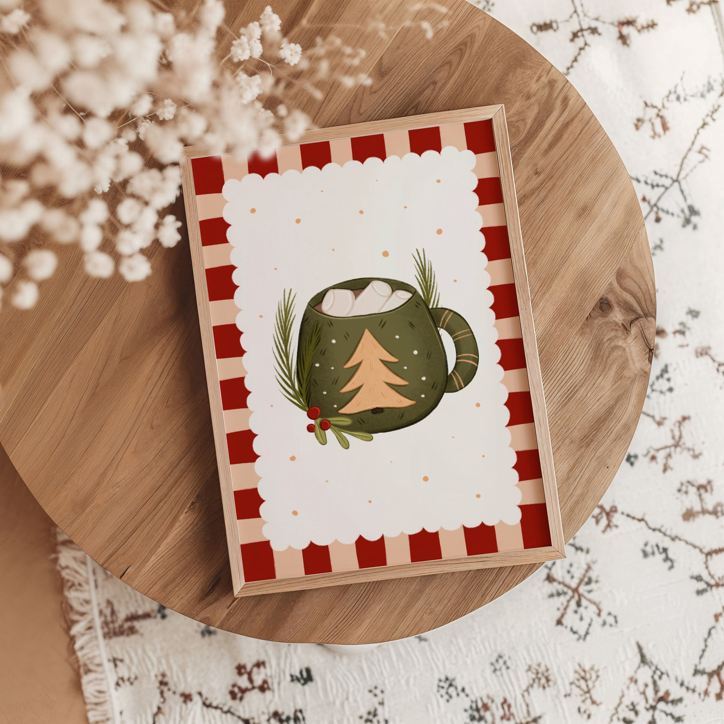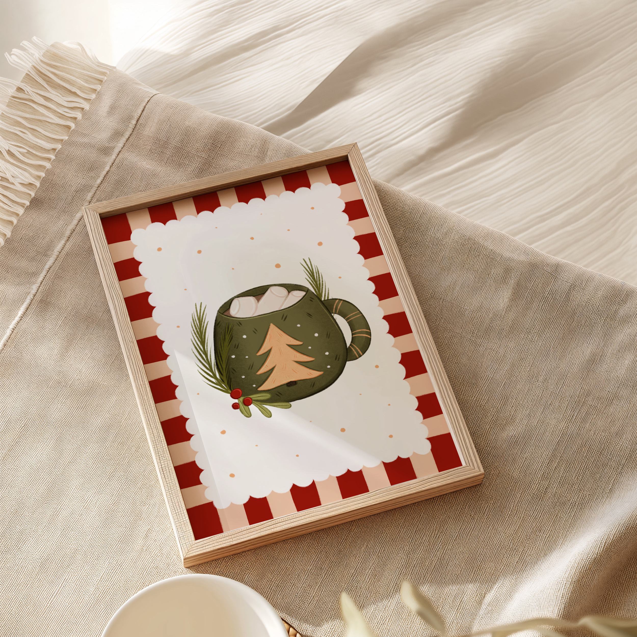 Uroczy plakat świąteczny z zielonym kubeczkiem.
