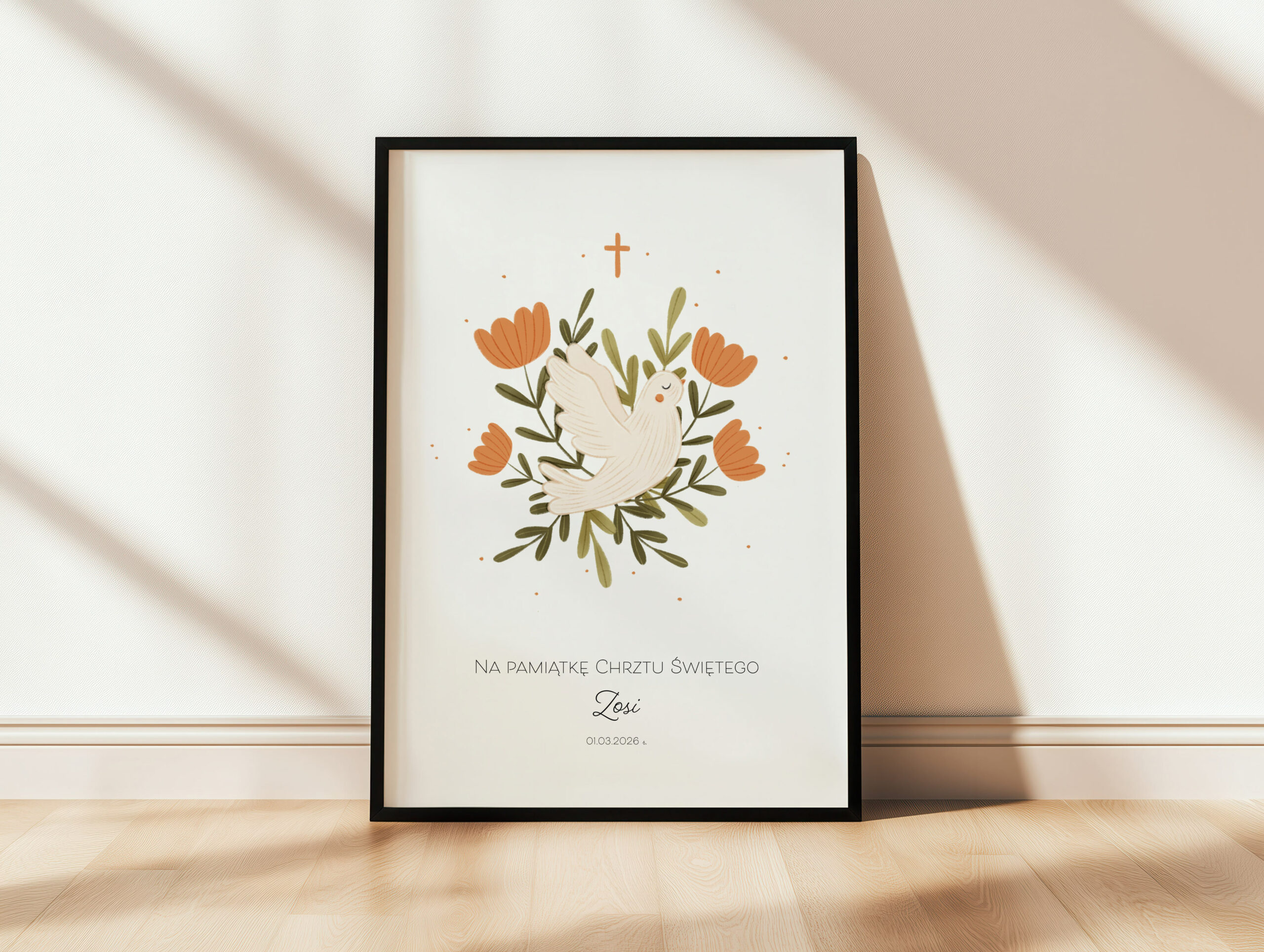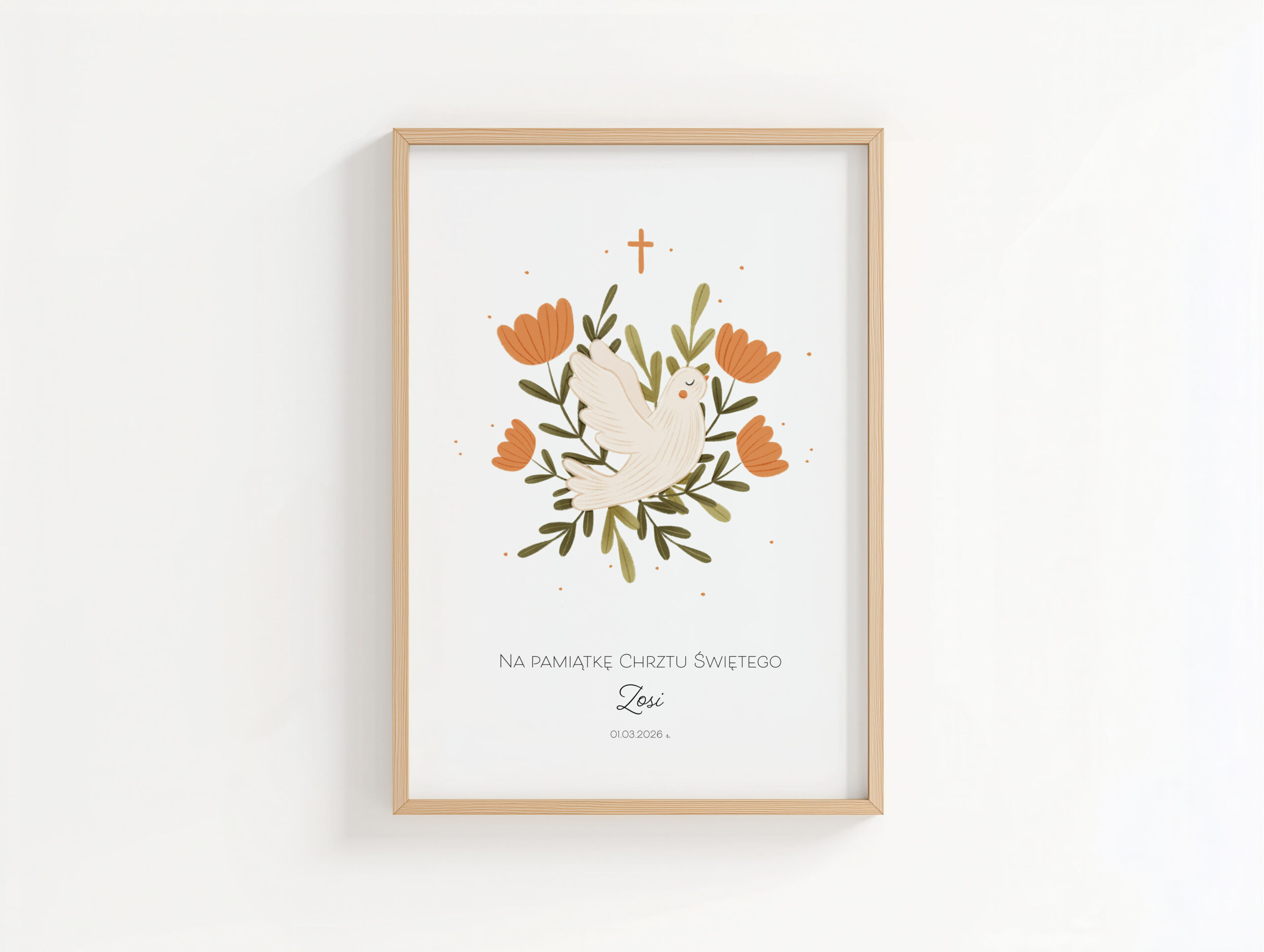 Elegancka Pamiątka Chrztu Świętego z gołąbkiem i motywem kwiatów.