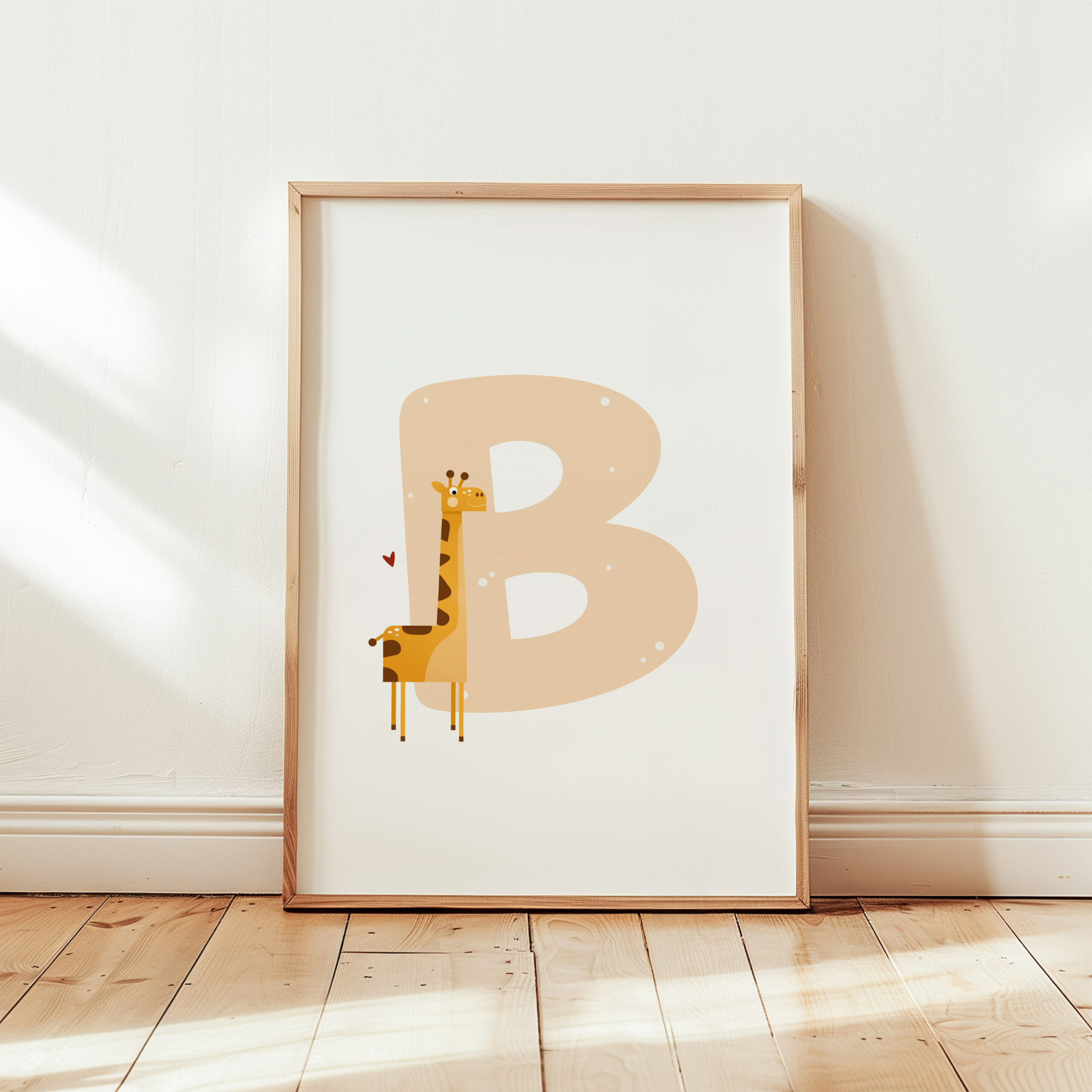 Plakat do pokoju dziecięcego z pierwszą literą imienia i uroczym motywem żyrafy.