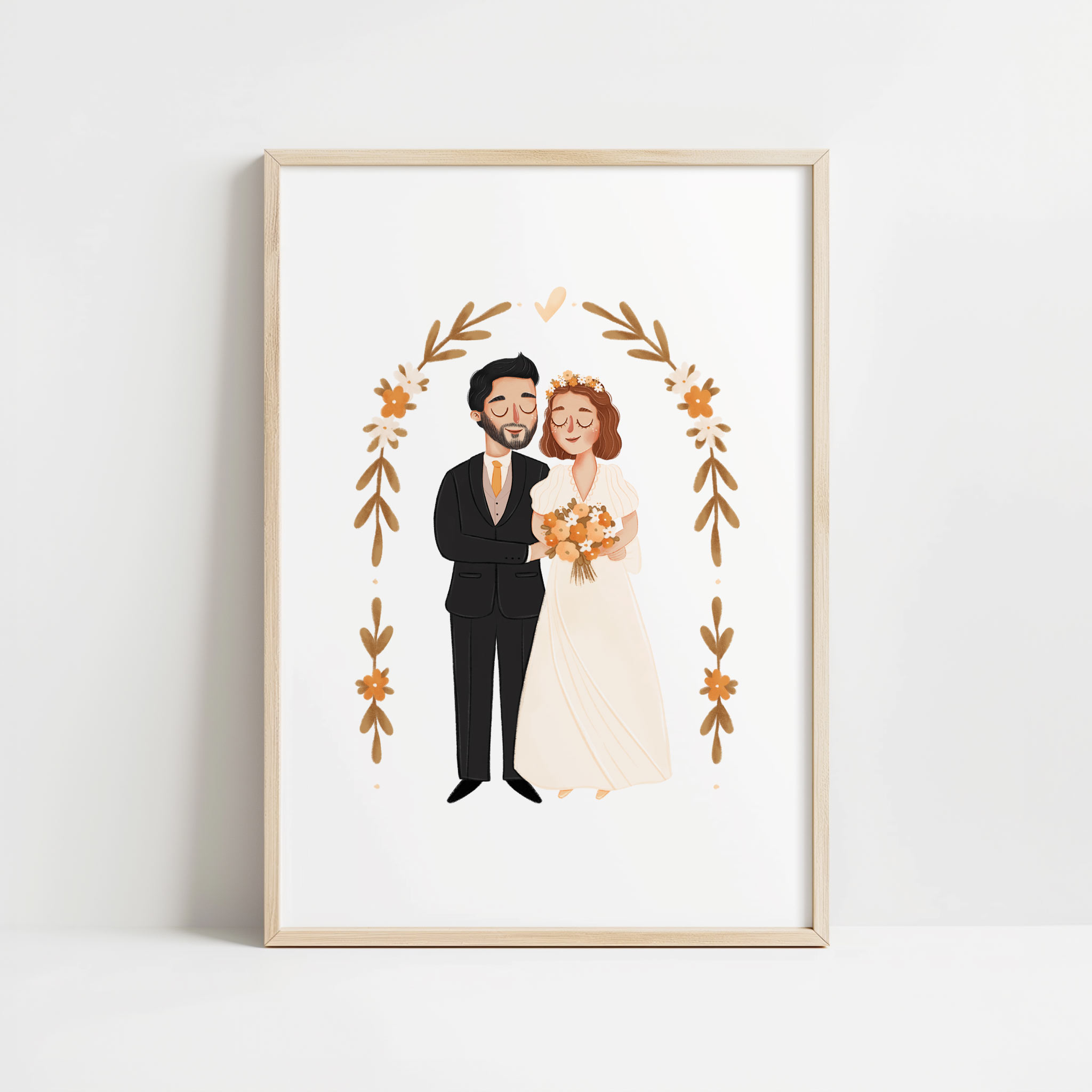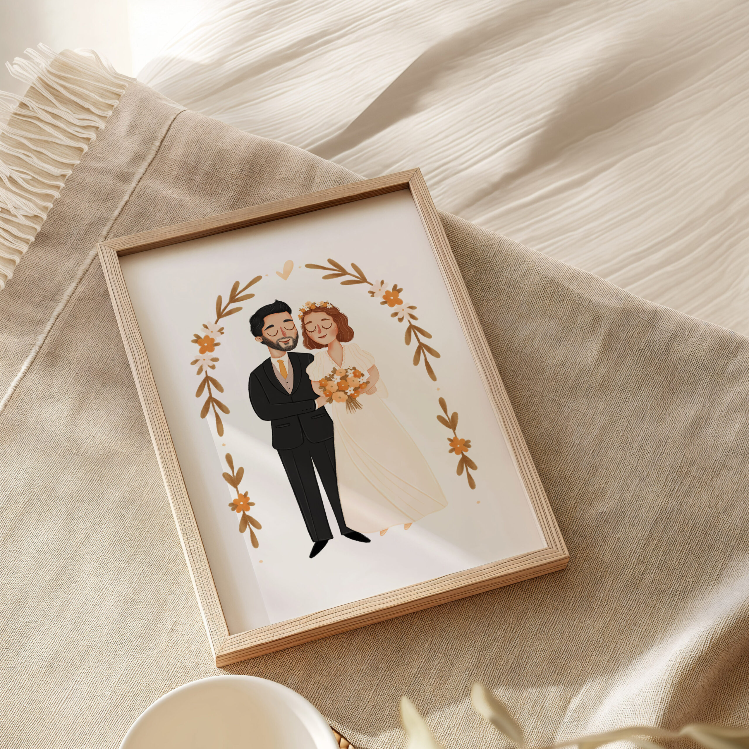 Zaznaczam, że nie jest to portret realistyczny. To urocza, bajkowa wersja każdej z osób. Stroje rysowane są na podstawie przesłanych przez Państwa zdjęć lub wskazówek. Bukiet również może zostać wykonany na podstawie zdjęcia lub można określić jego kolorystykę. Ornament z kwiatów wokół pary jest dopasowywany kolorystycznie do bukietu.