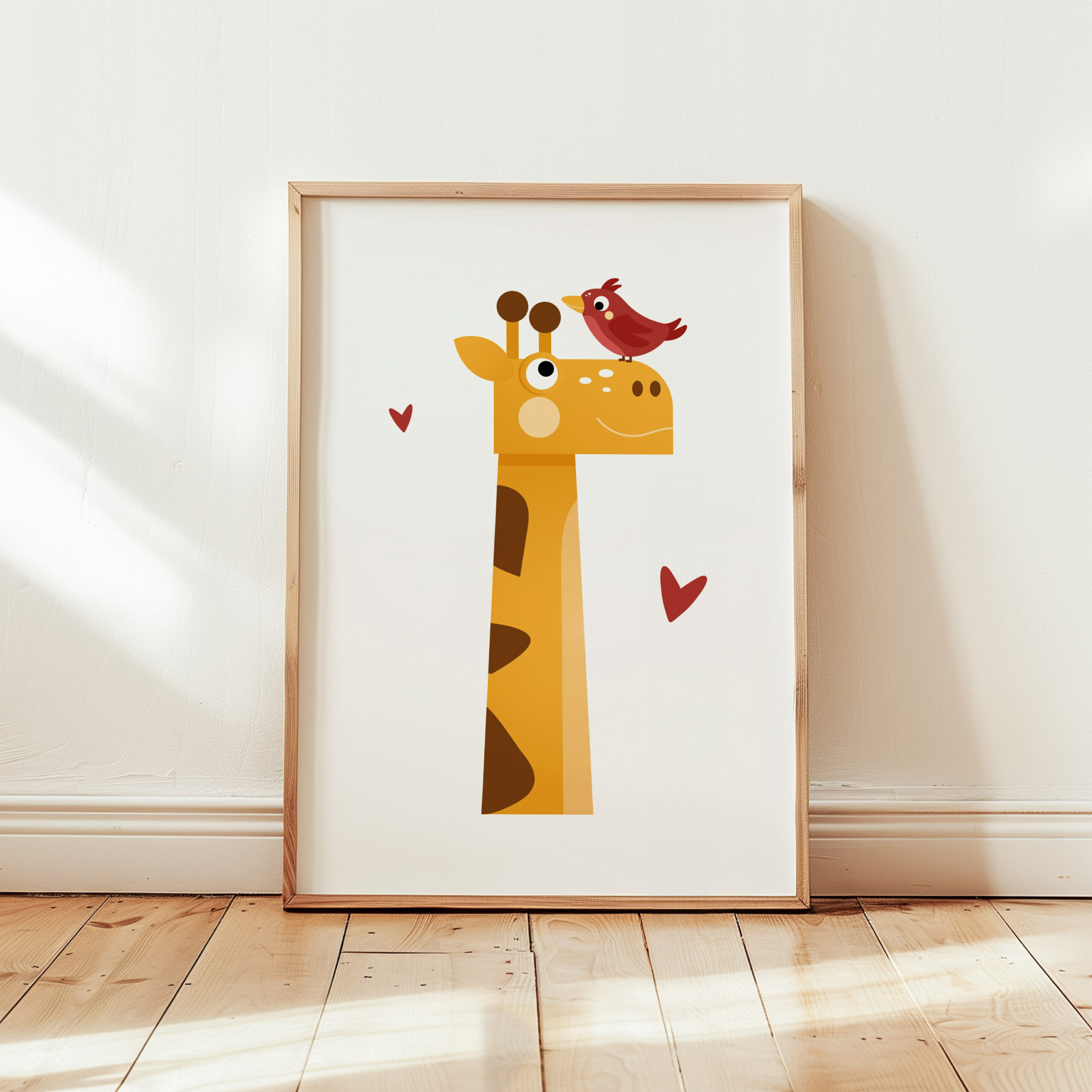 Plakat do pokoju dziecięcego z uroczą żyrafą i ptakiem.