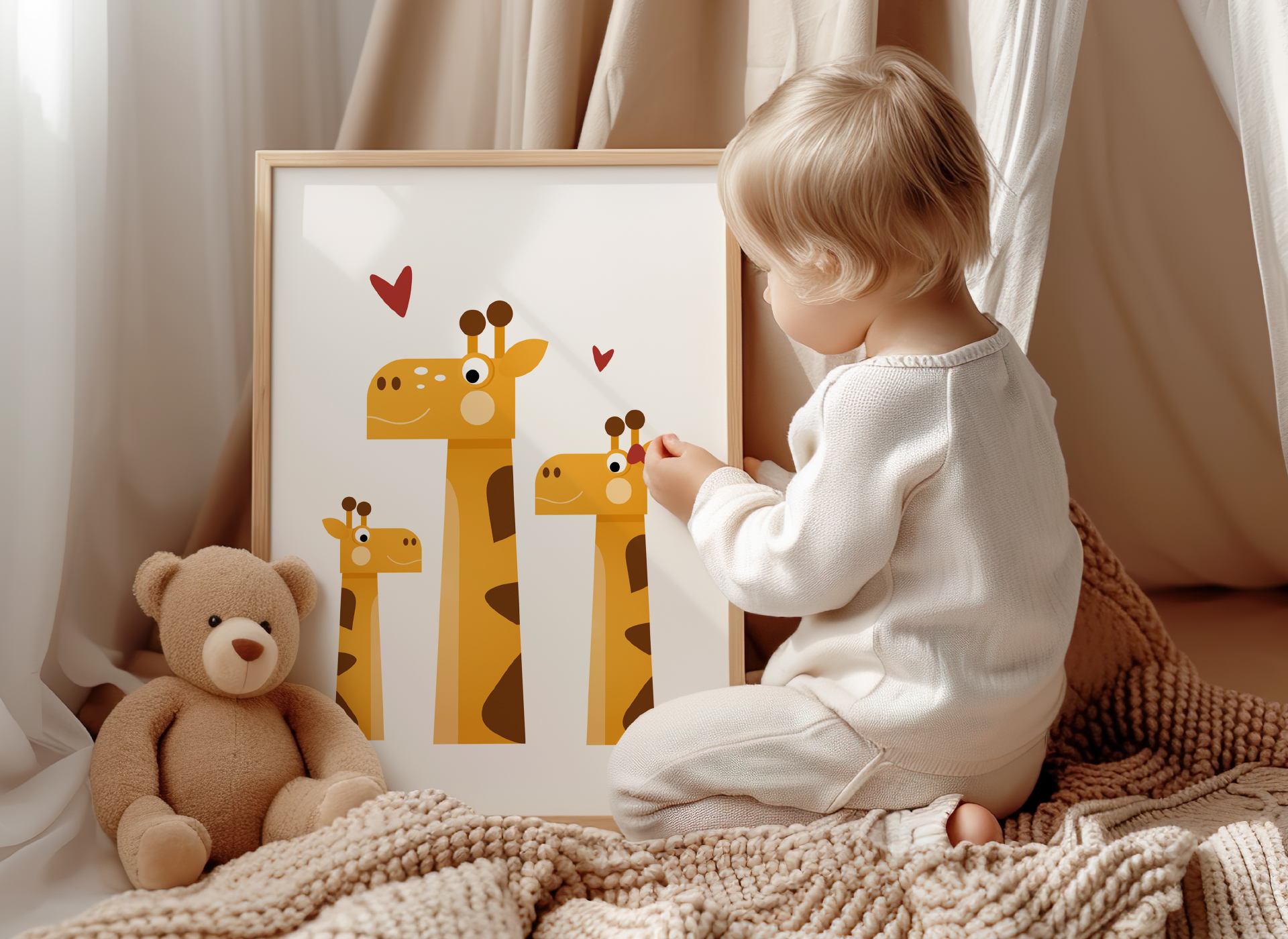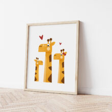 Plakat do pokoju dziecięcego z uroczą rodziną żyraf.